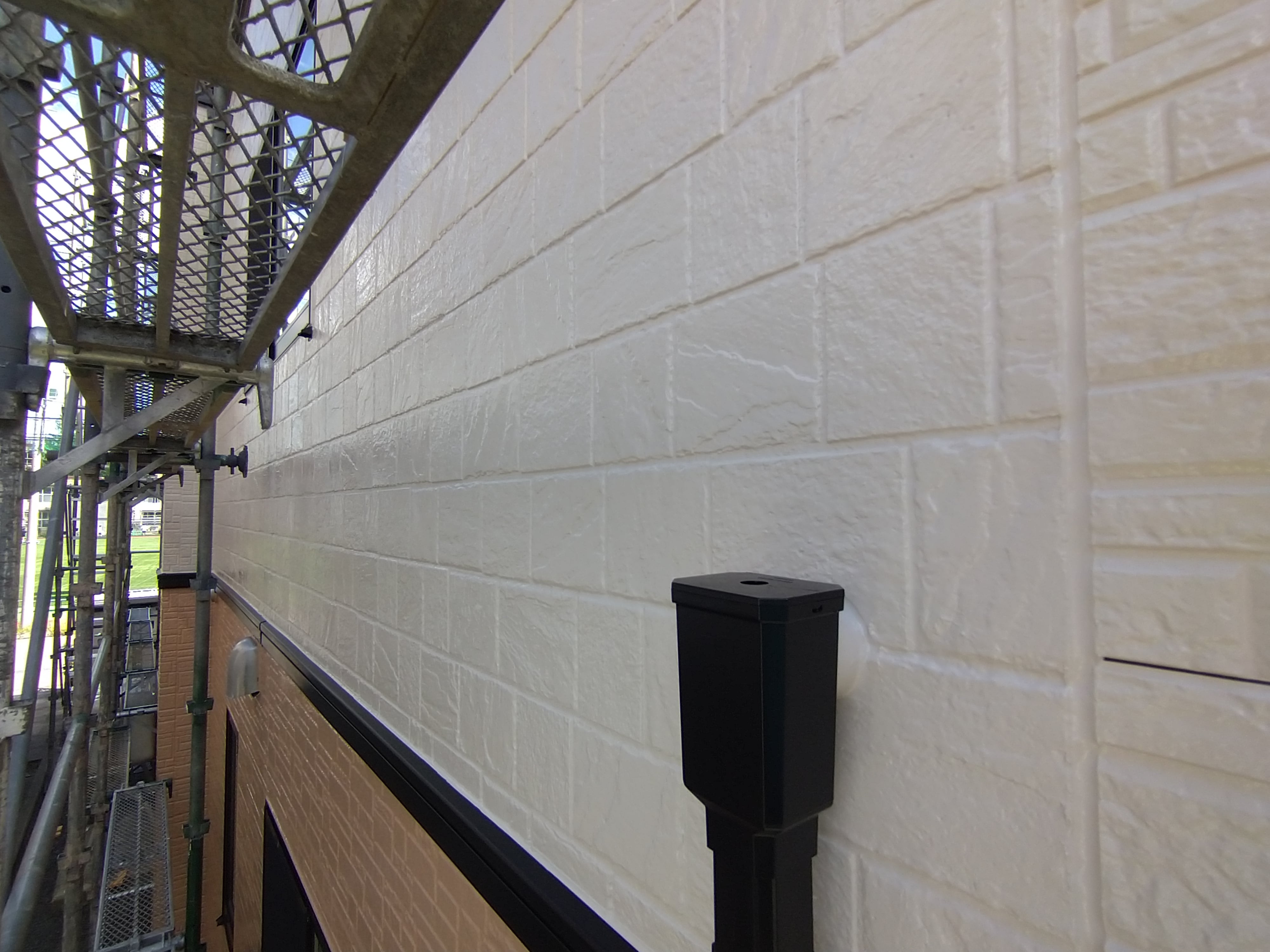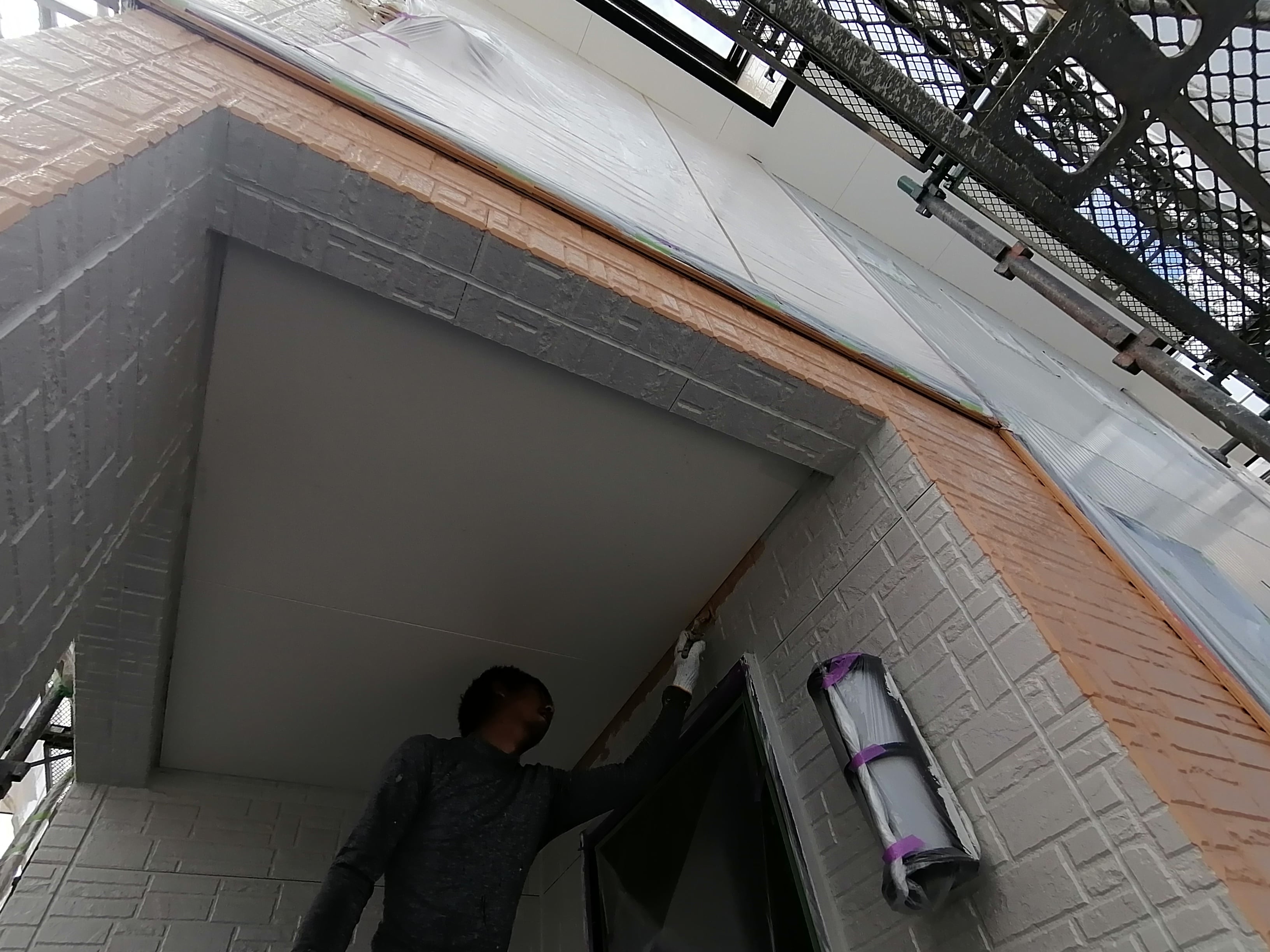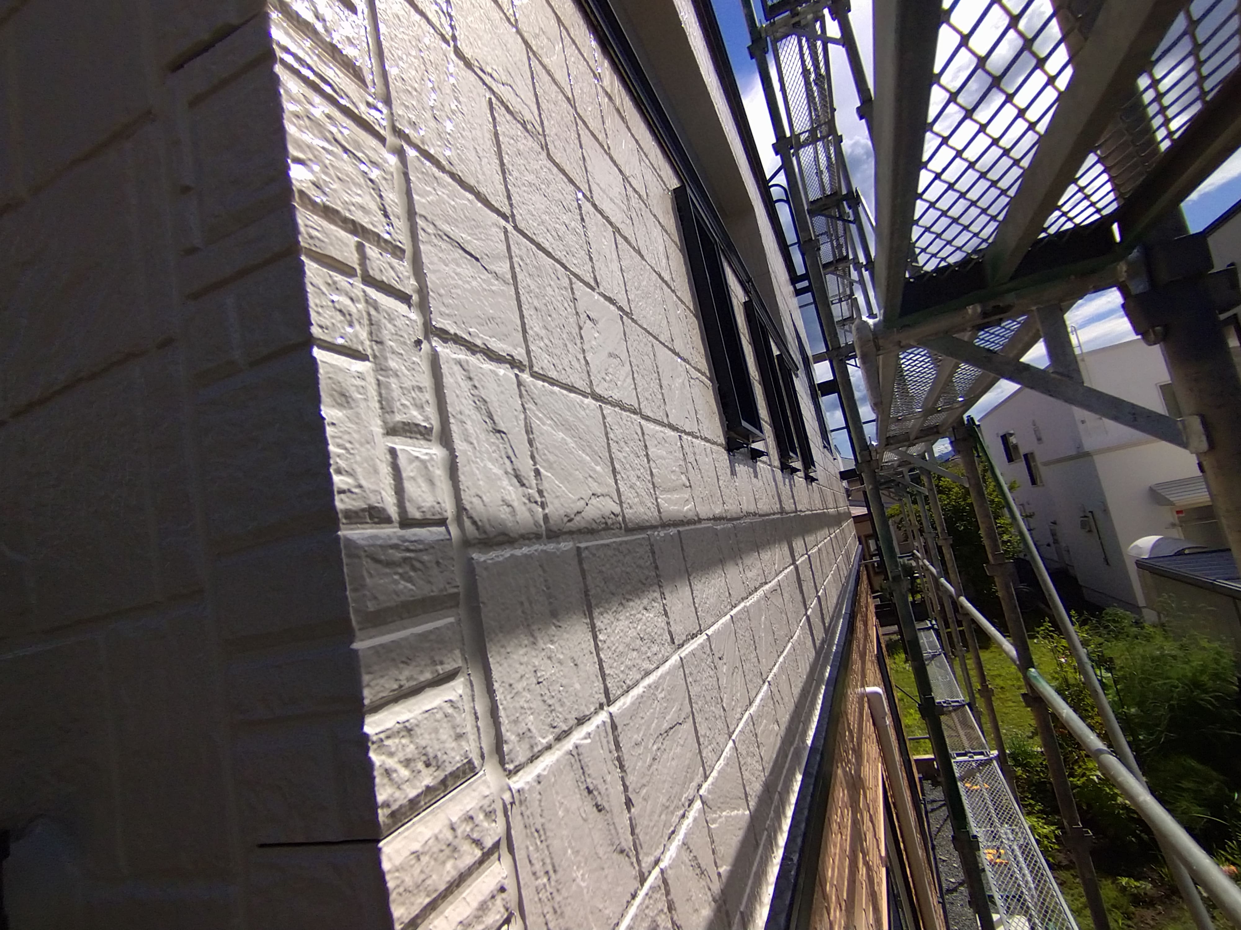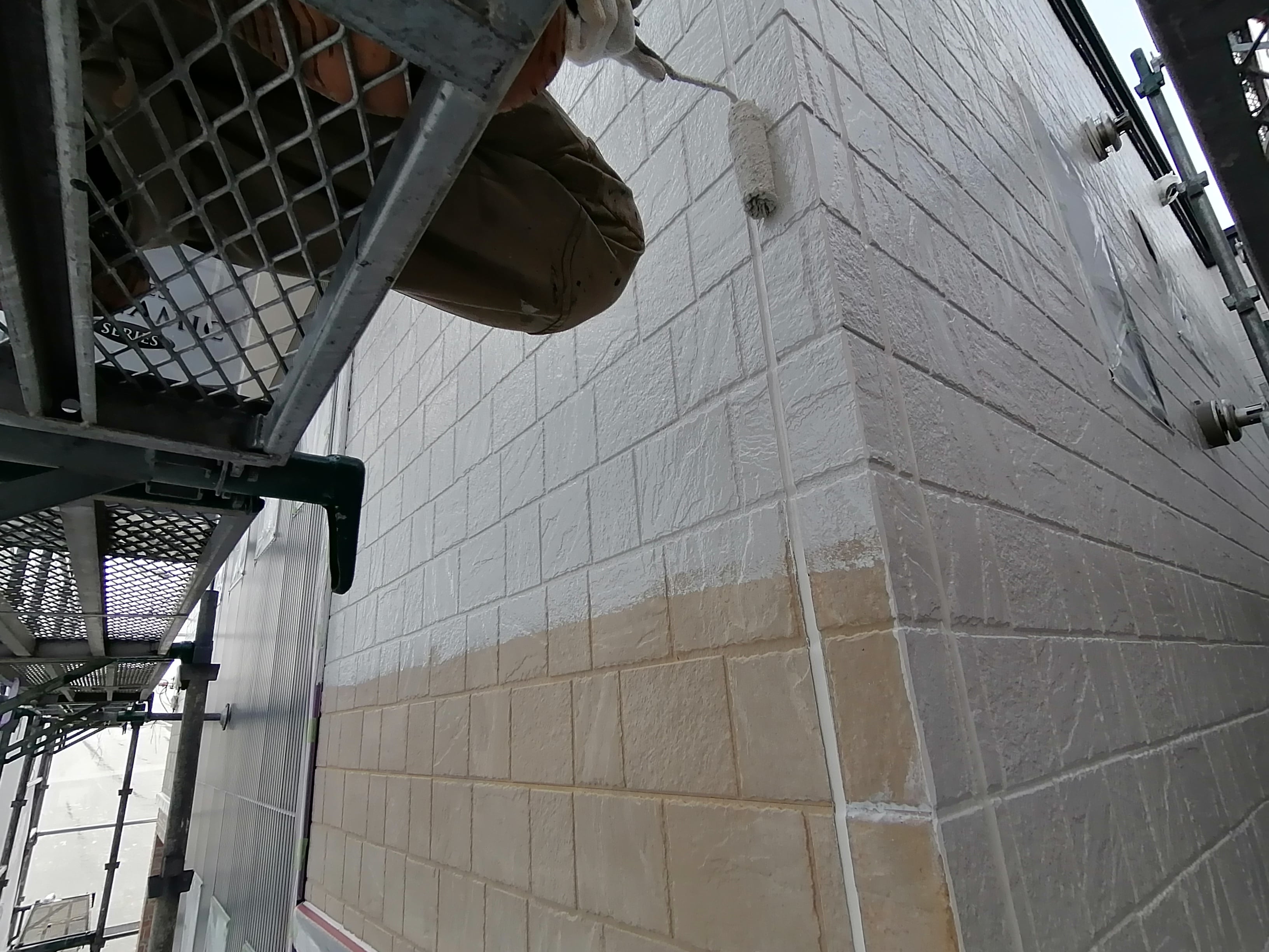 下塗りはお住まいの4面の内3面の状態が良いので1工程(浸透型高密着のシーラー)。他の1面部分の劣化が激しく、パテ補修も多かったのでプラス1工程(微弾性フィラー)行いました。