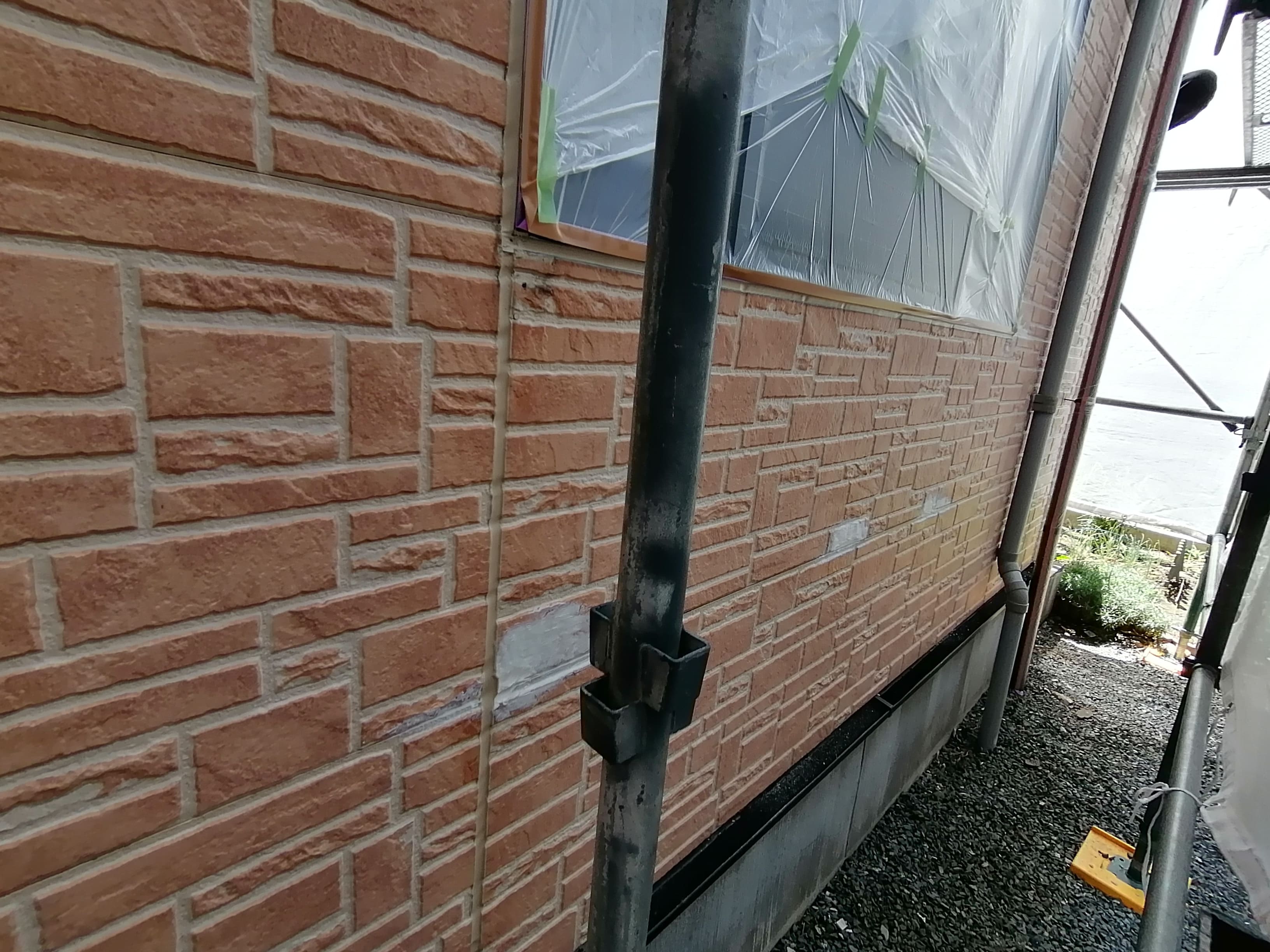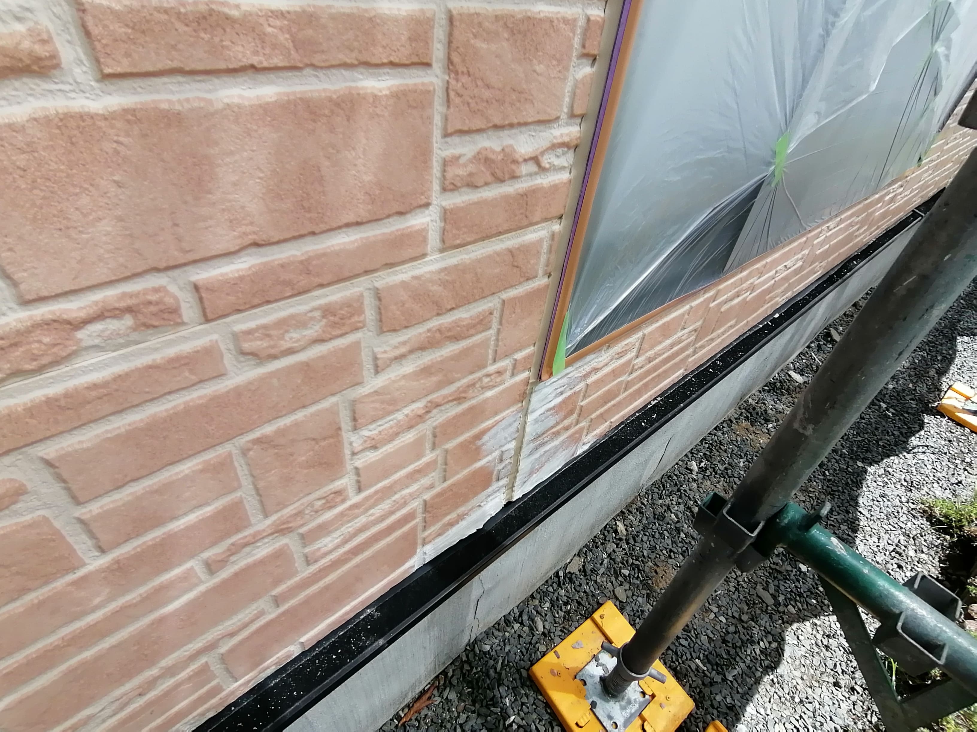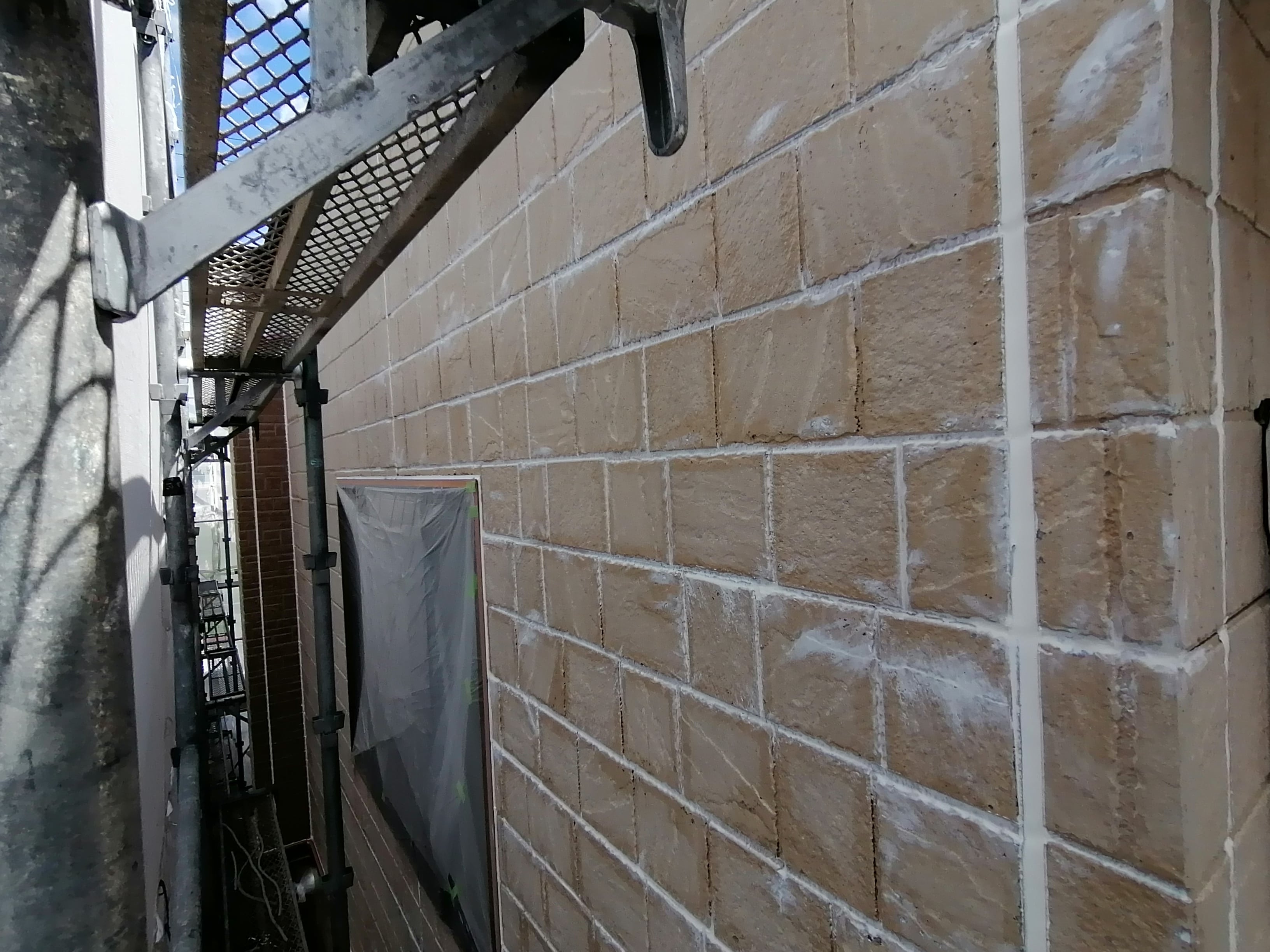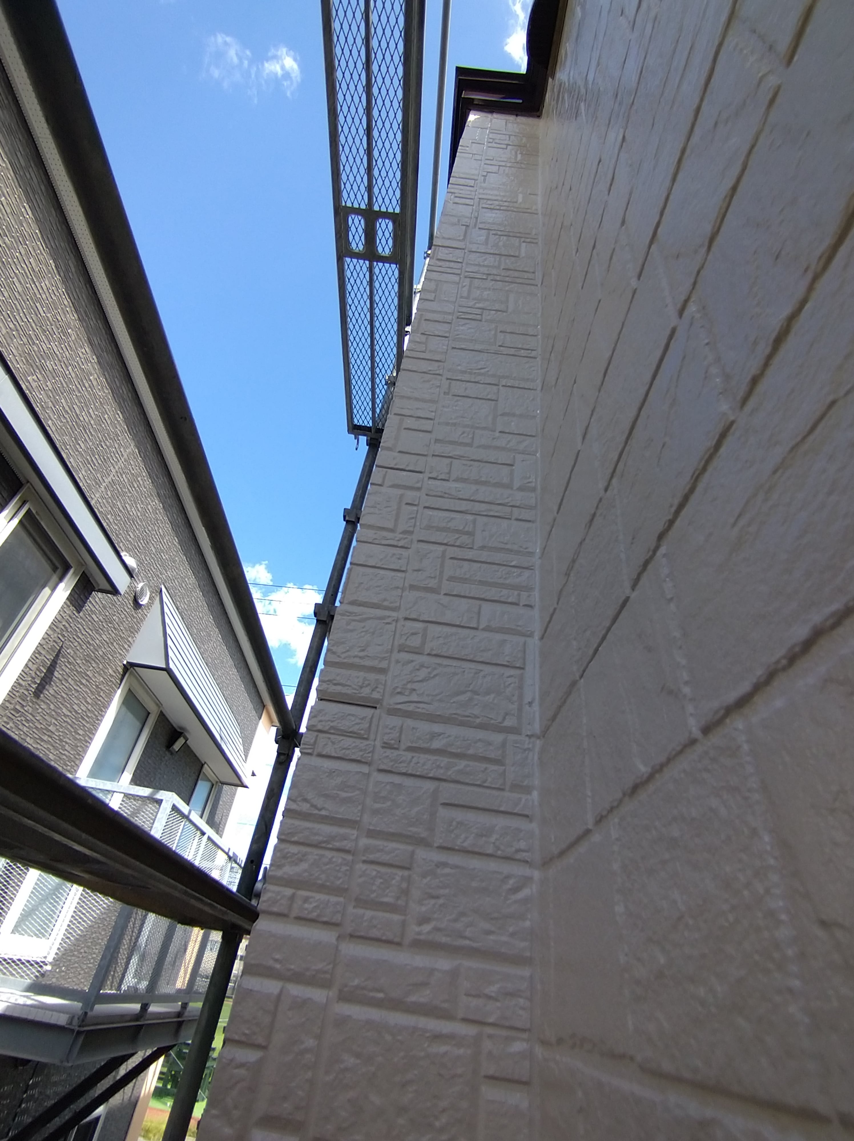 下塗りはお住まいの4面の内3面の状態が良いので1工程(浸透型高密着のシーラー)。他の1面部分の劣化が激しく、パテ補修も多かったのでプラス1工程(微弾性フィラー)行いました。