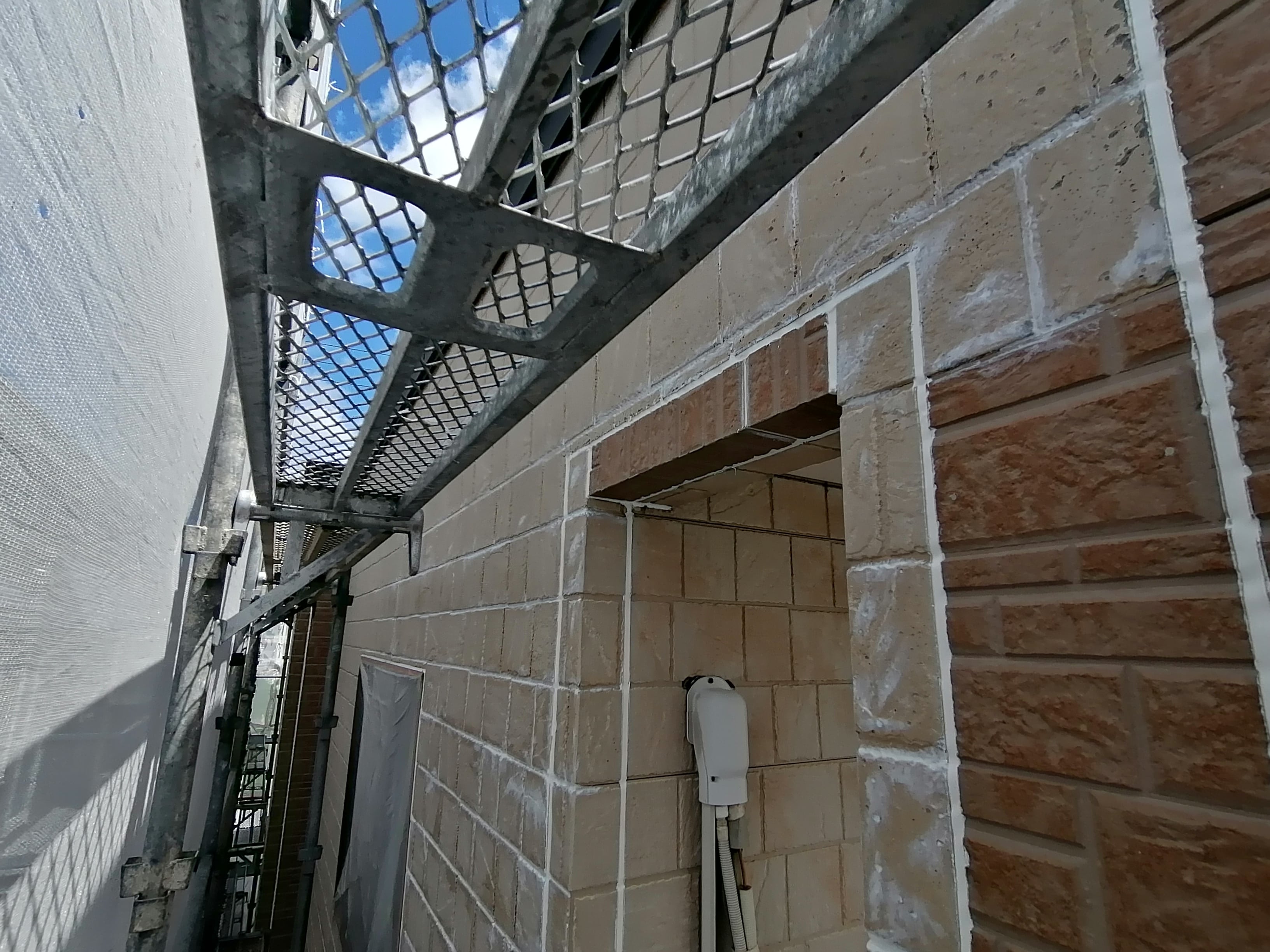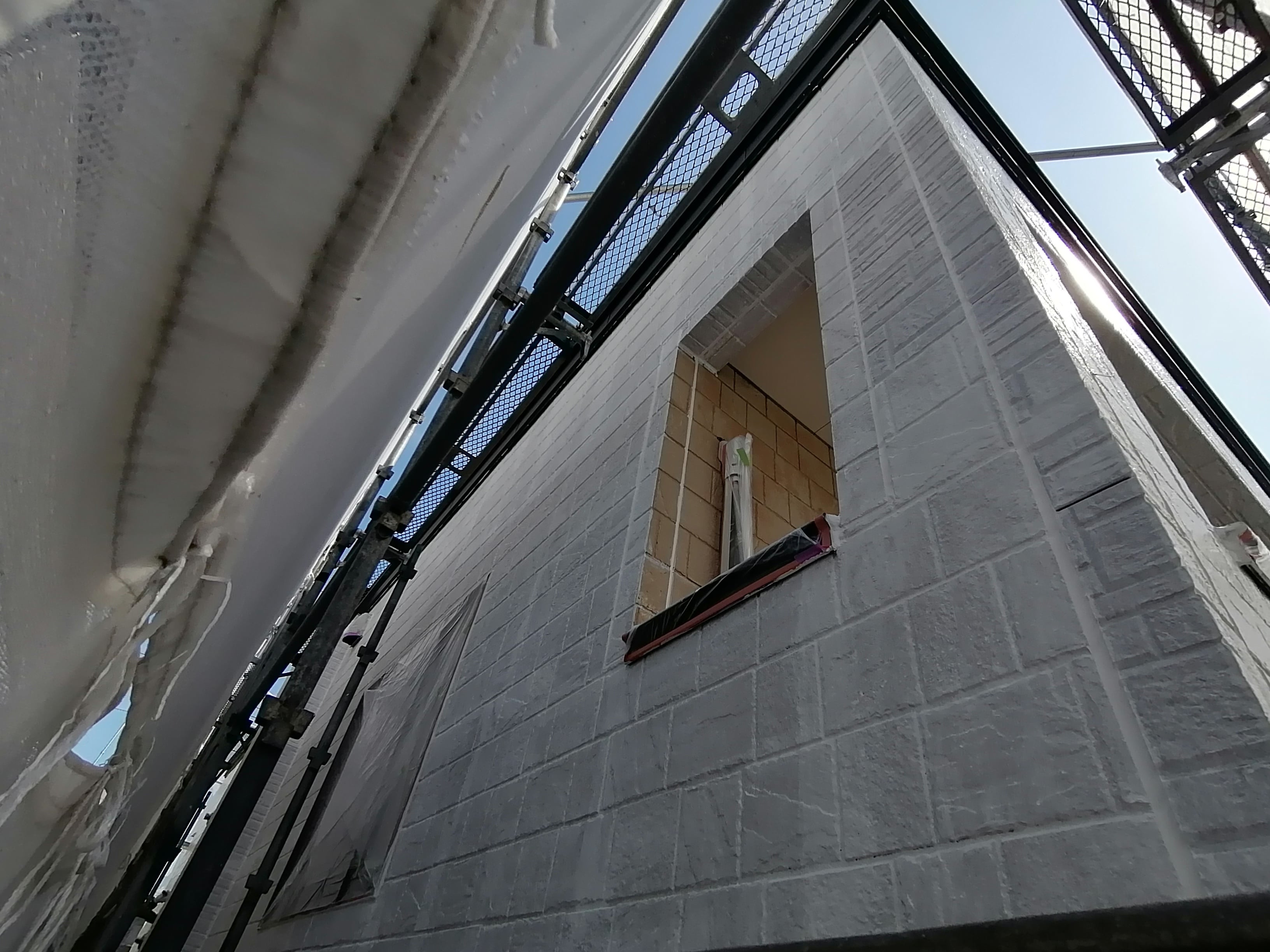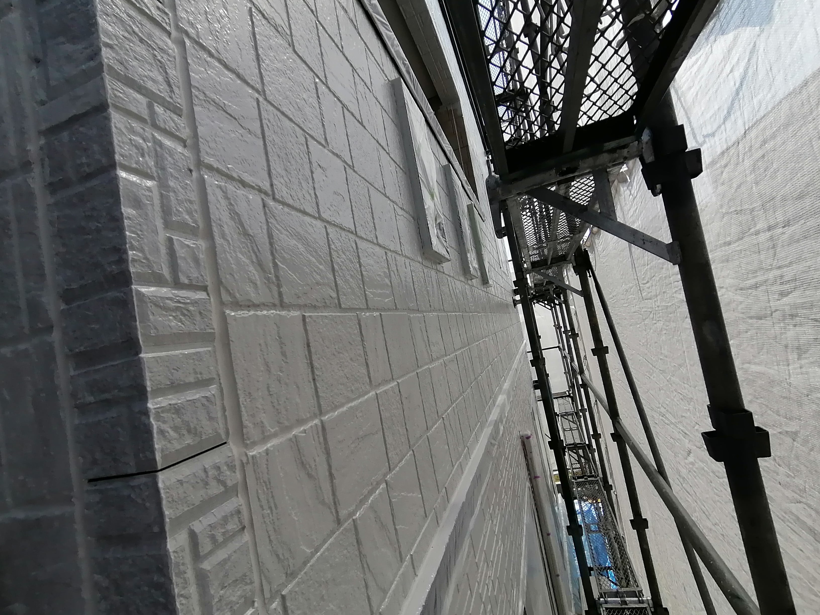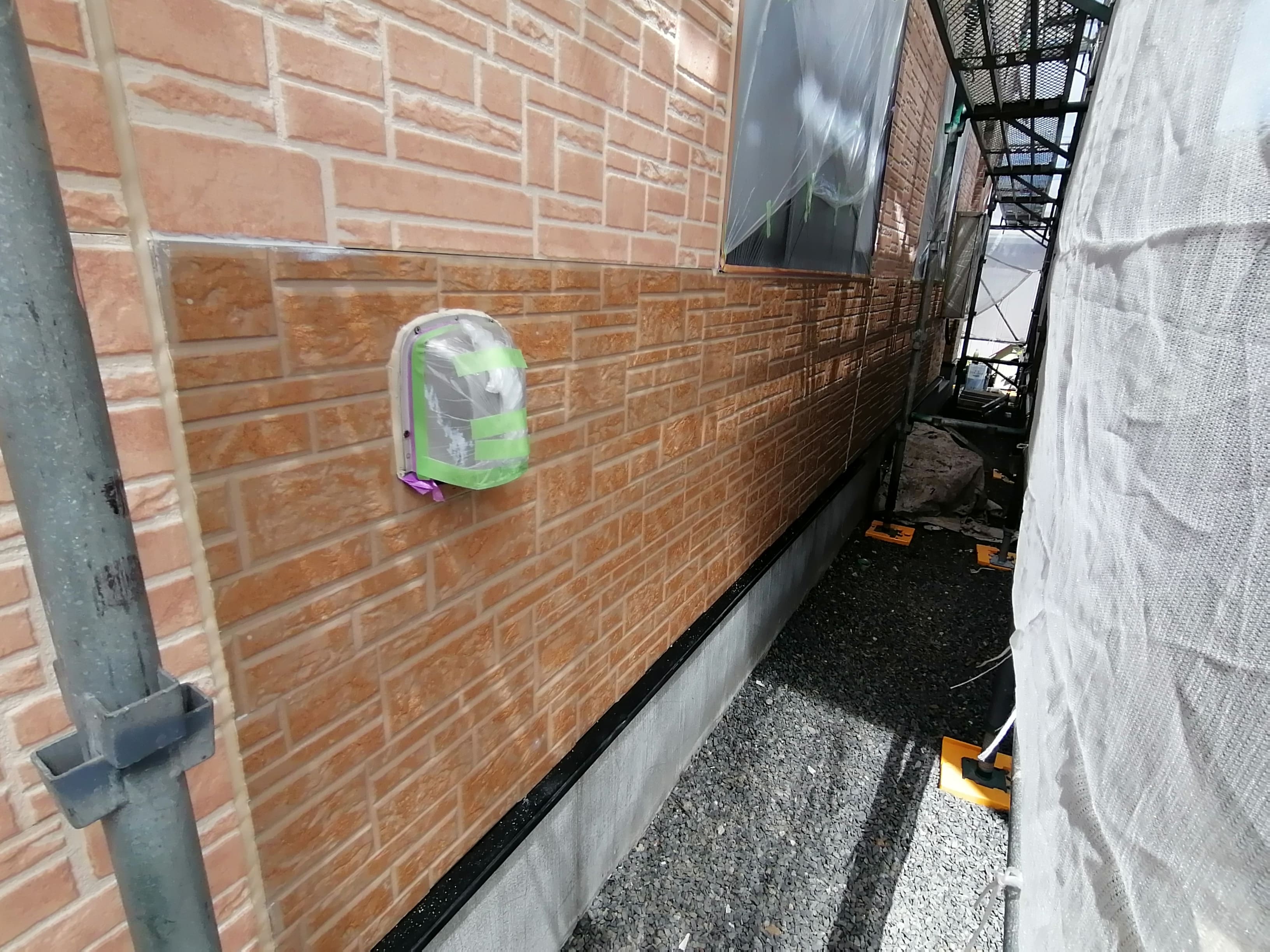 下塗りはお住まいの4面の内3面の状態が良いので1工程(浸透型高密着のシーラー)。他の1面部分の劣化が激しく、パテ補修も多かったのでプラス1工程(微弾性フィラー)行いました。