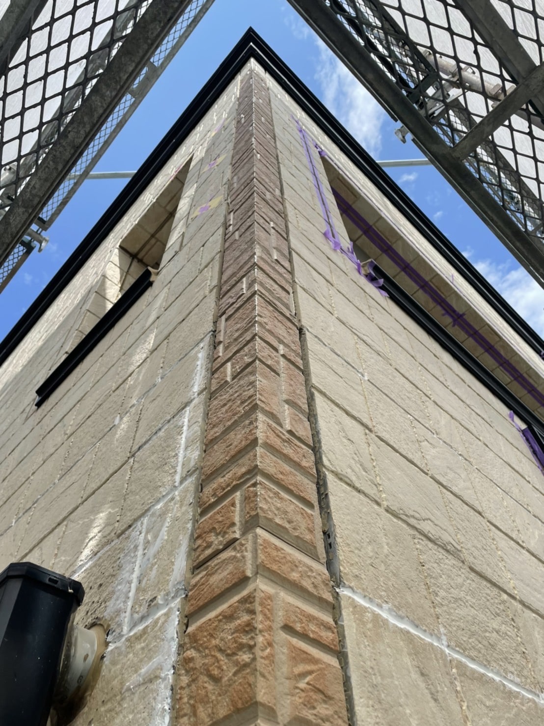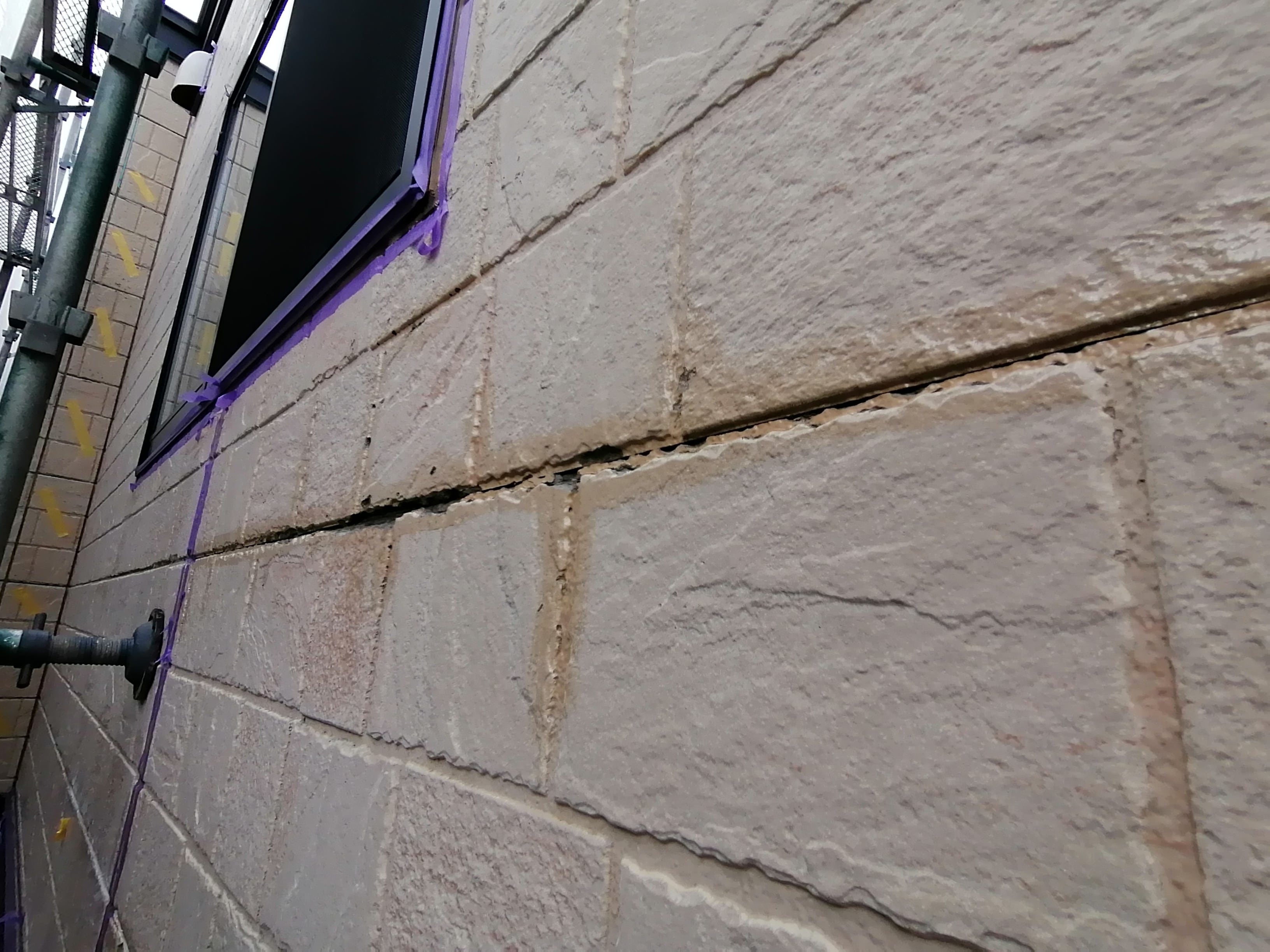 高圧洗浄にて脆弱になった外壁材表面をこれでもかというくらい剥がれそうな箇所を剥がしてからの、高耐久高密着のパテ補修に取り掛かります!パテ補修の前に、しっかりたっぷり専用のプライマーを剥がれ部分の奥底まで浸透させて脆弱な部分をしっかり固化させます。それから剥がれてしまった箇所をパテ補修して塗装前の下地をしっかりと造ります。