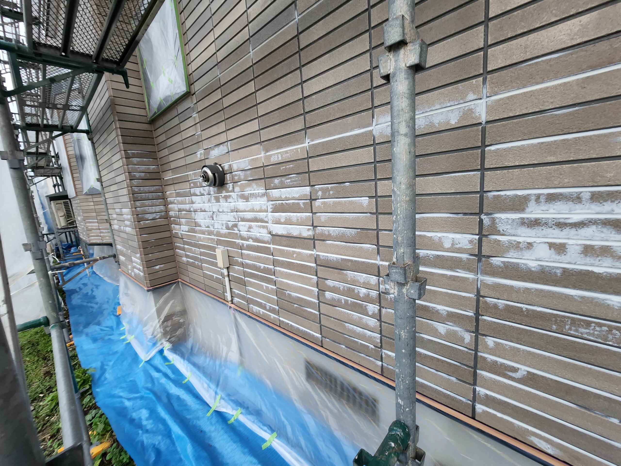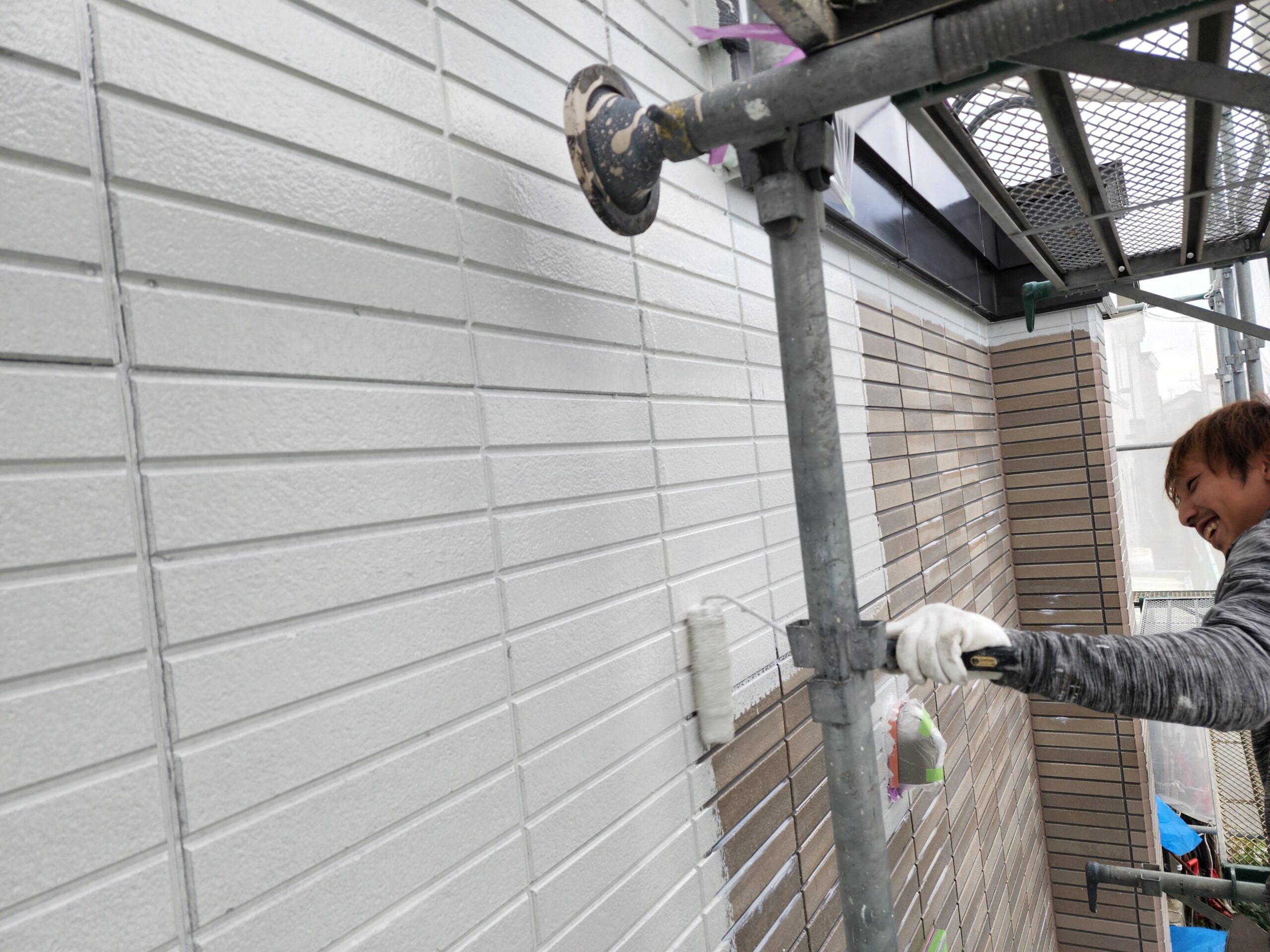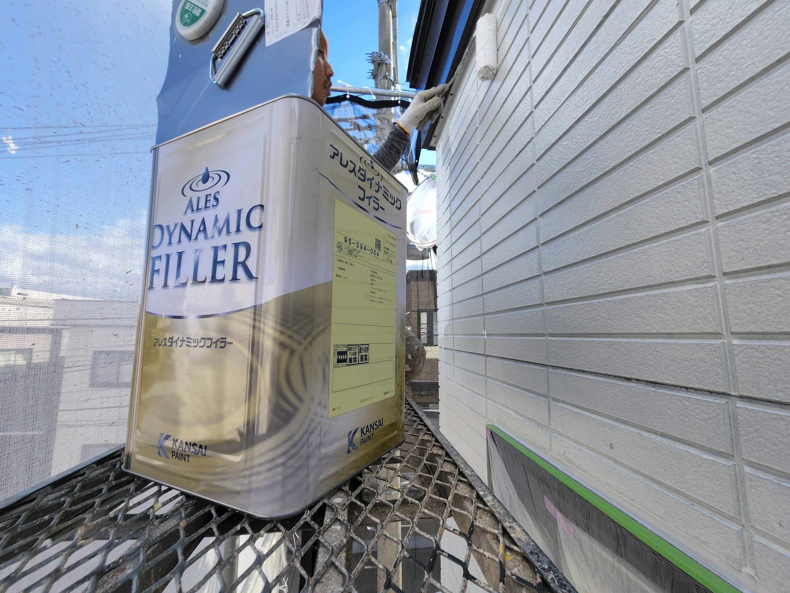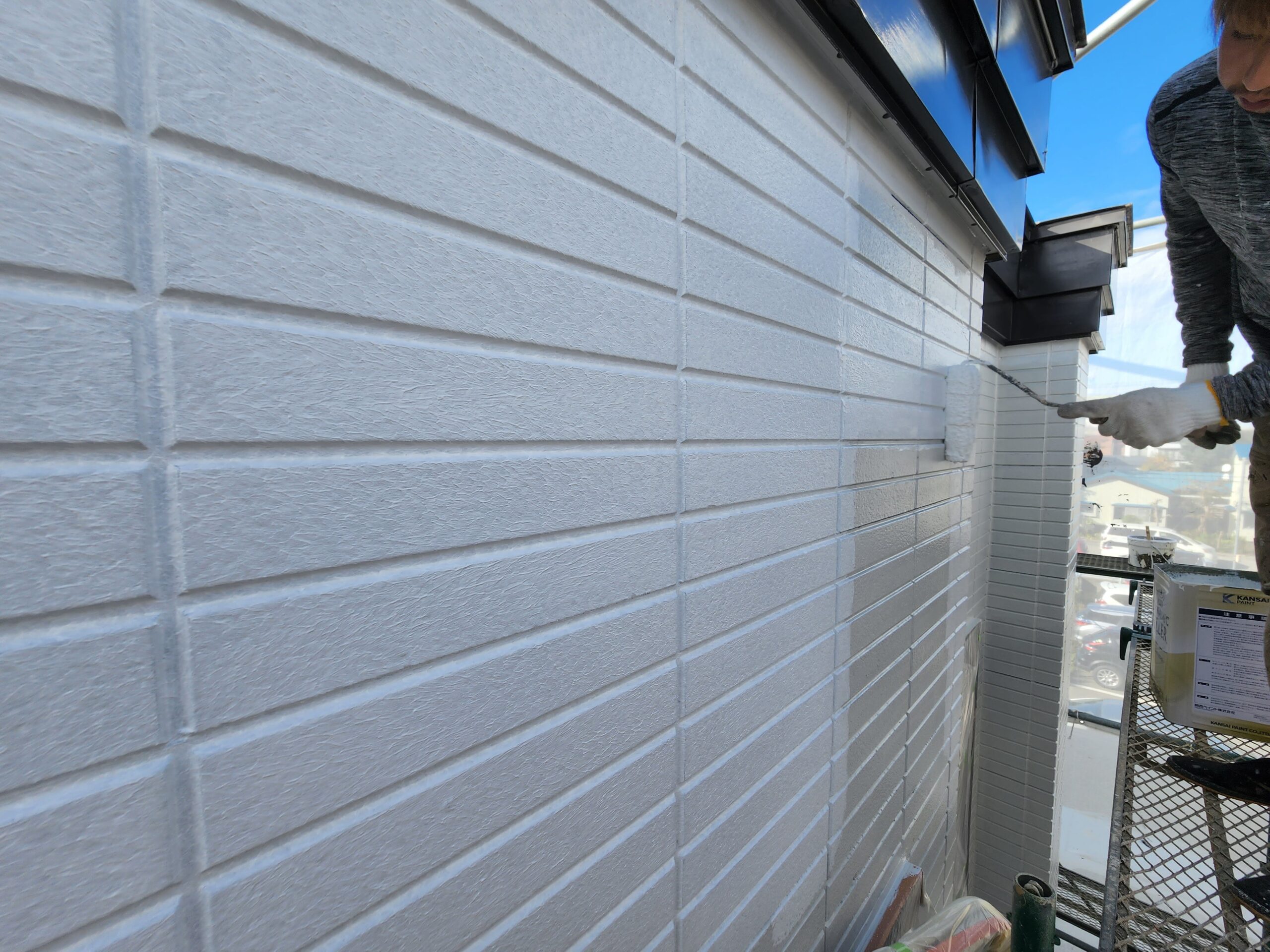 また下塗り材は通常1工程ですがこちらでは浸透型高密着のシーラー塗装をしてから、膜厚をとって軽微な外壁の劣化部分を補修してくれる役割をもつ微弾性フィラーを塗装と2工程を下塗りで施工しました。