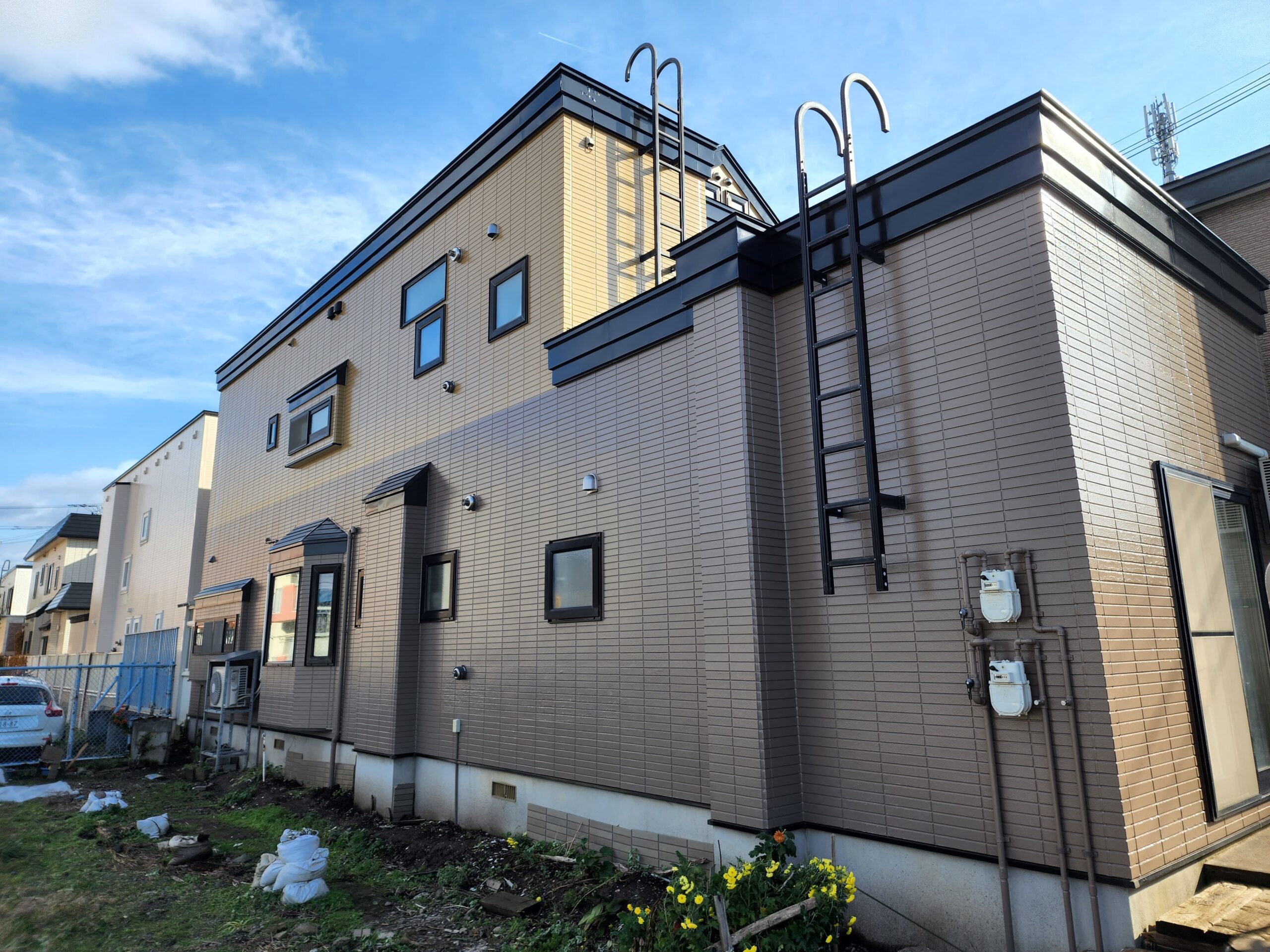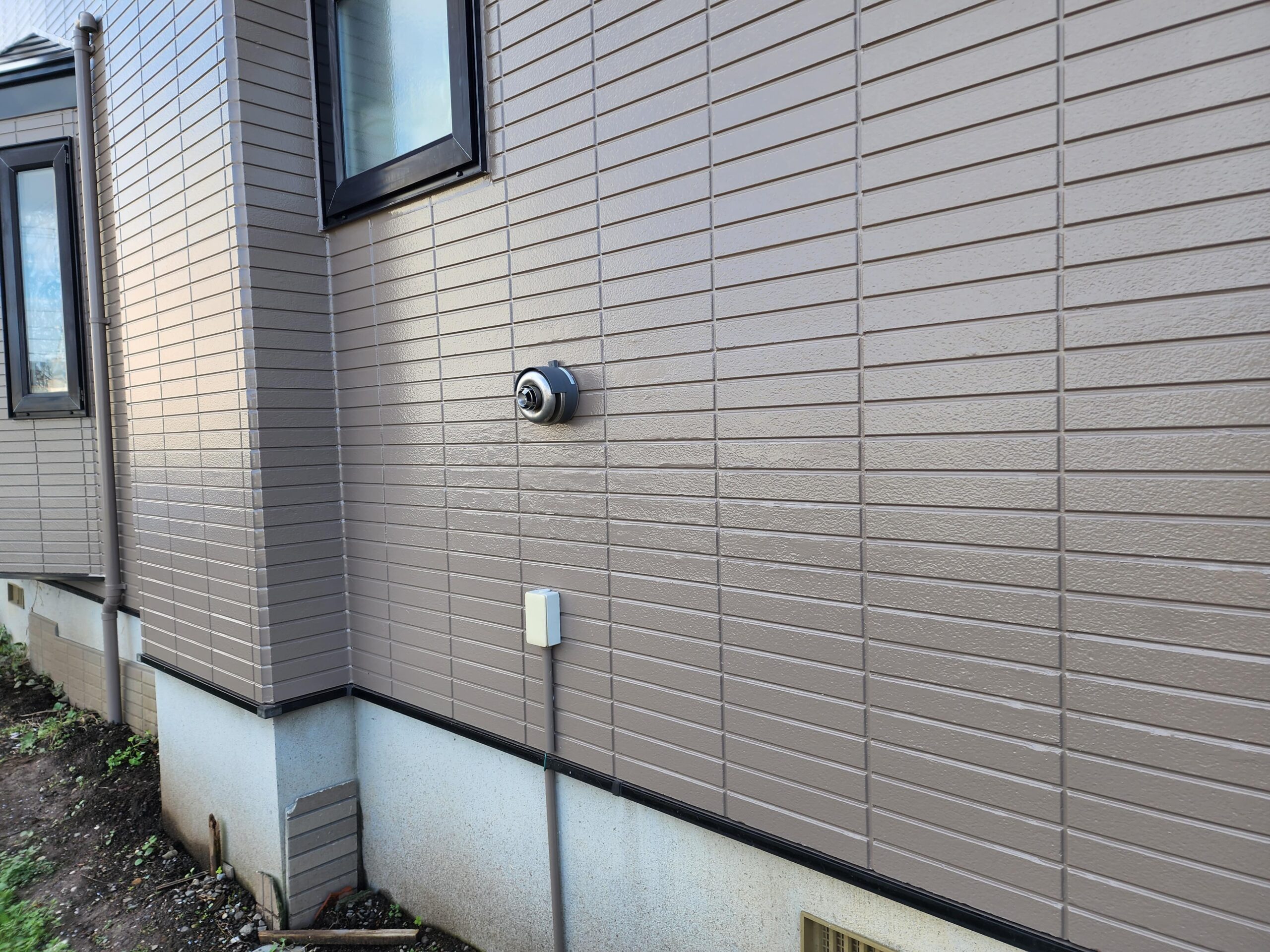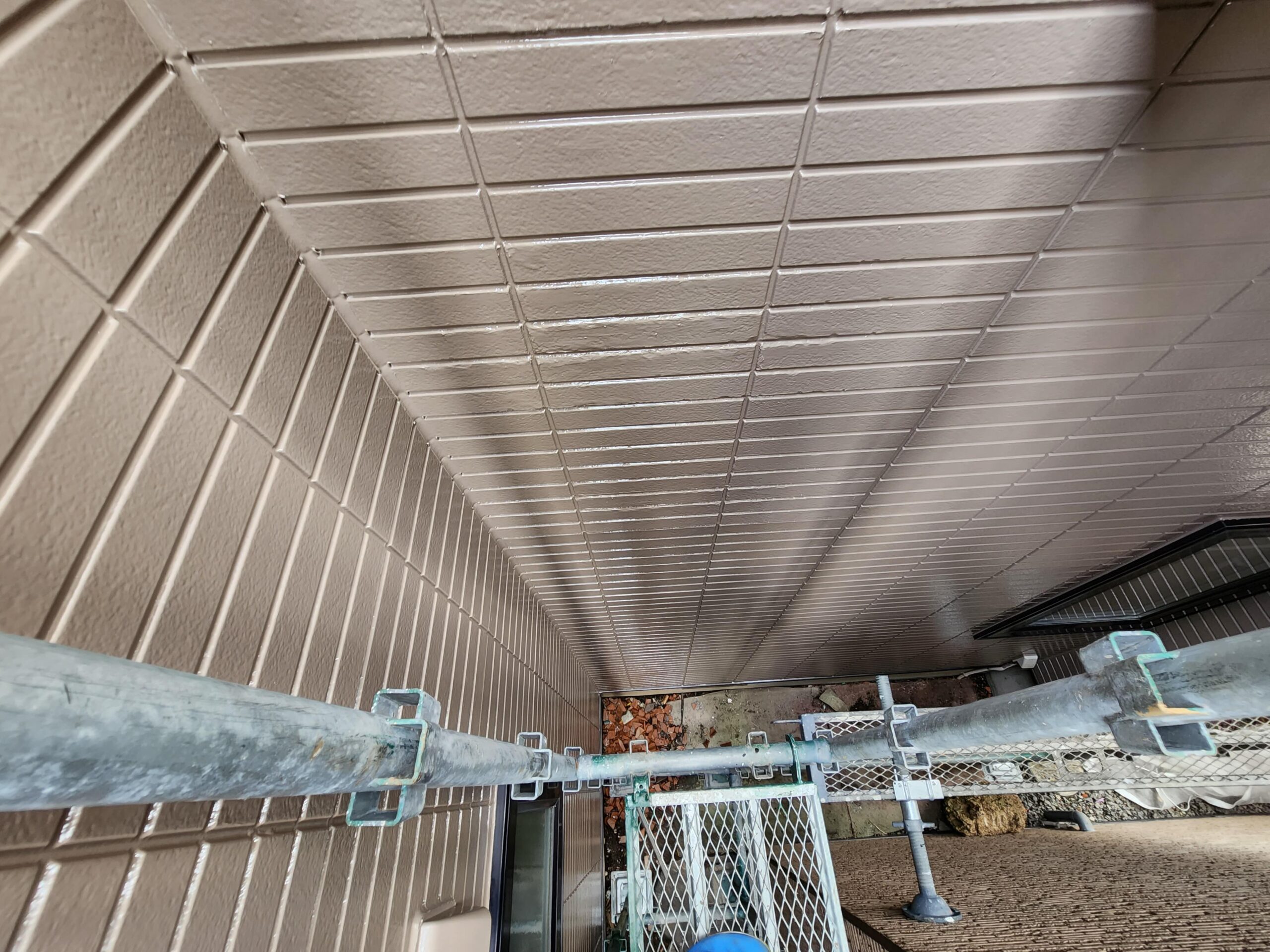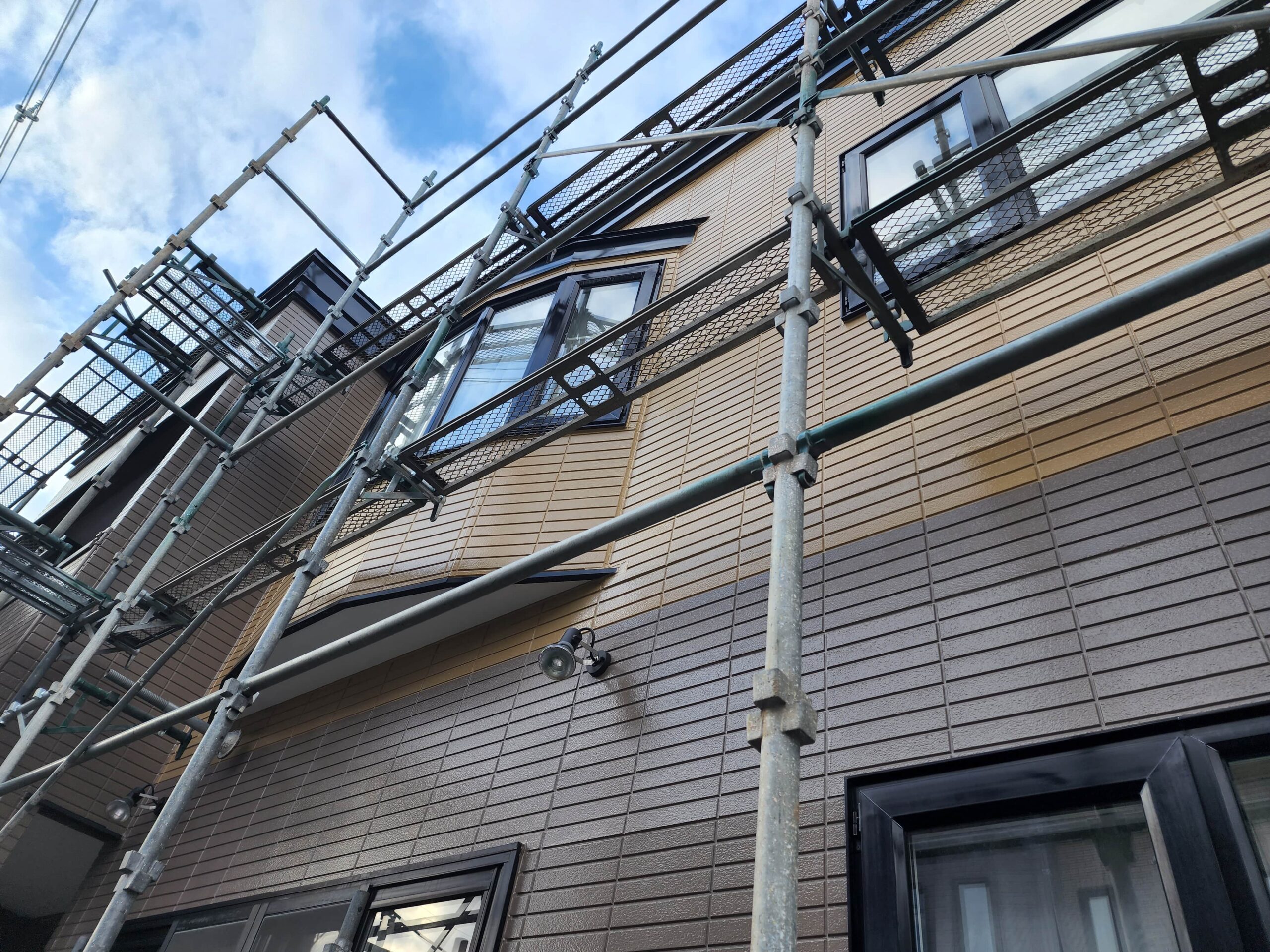 中塗り、上塗りは施主様のご希望で1階部分と2階部分で色を分けてるツートーンで中塗り、上塗りは塗装しました。