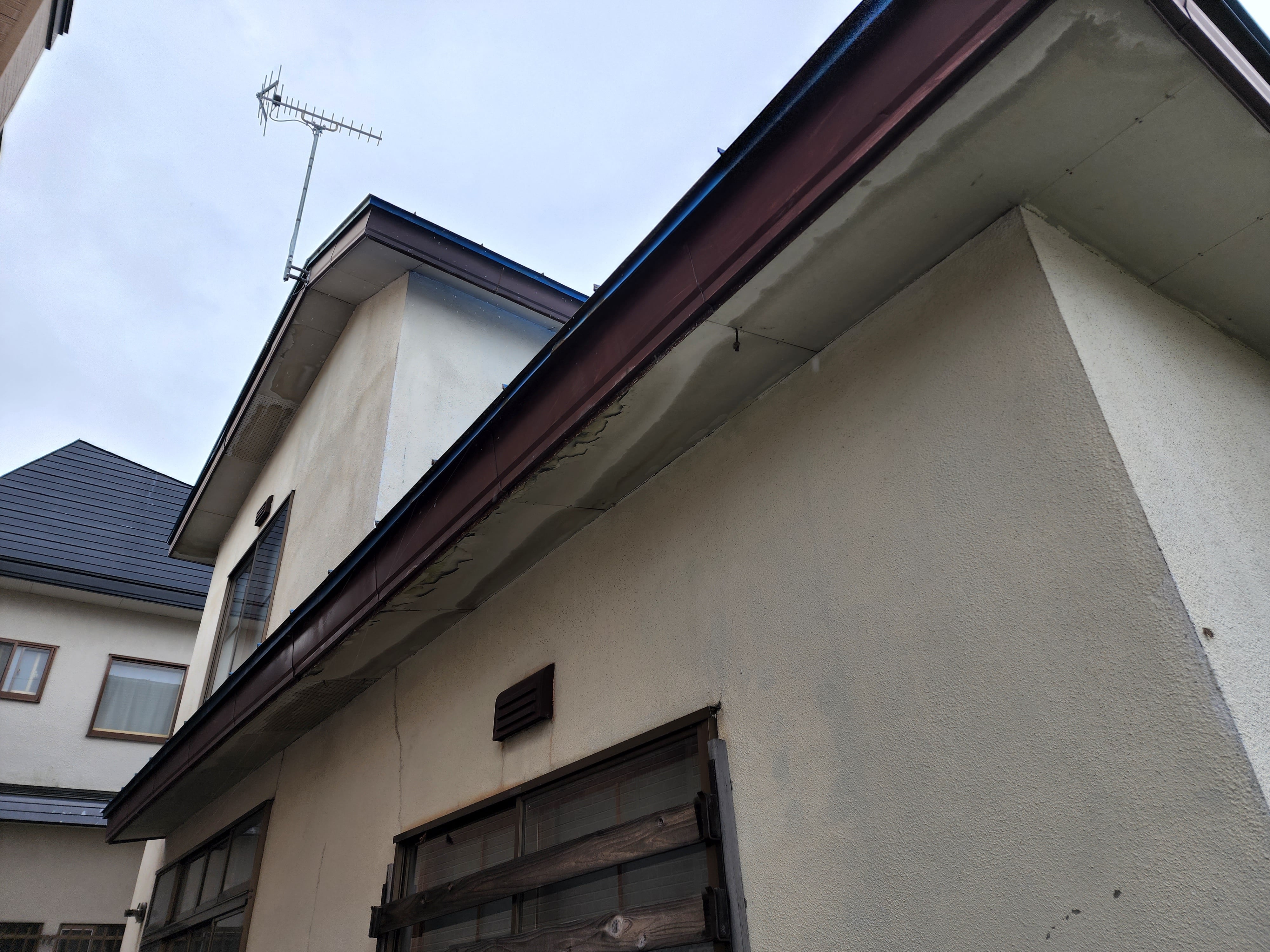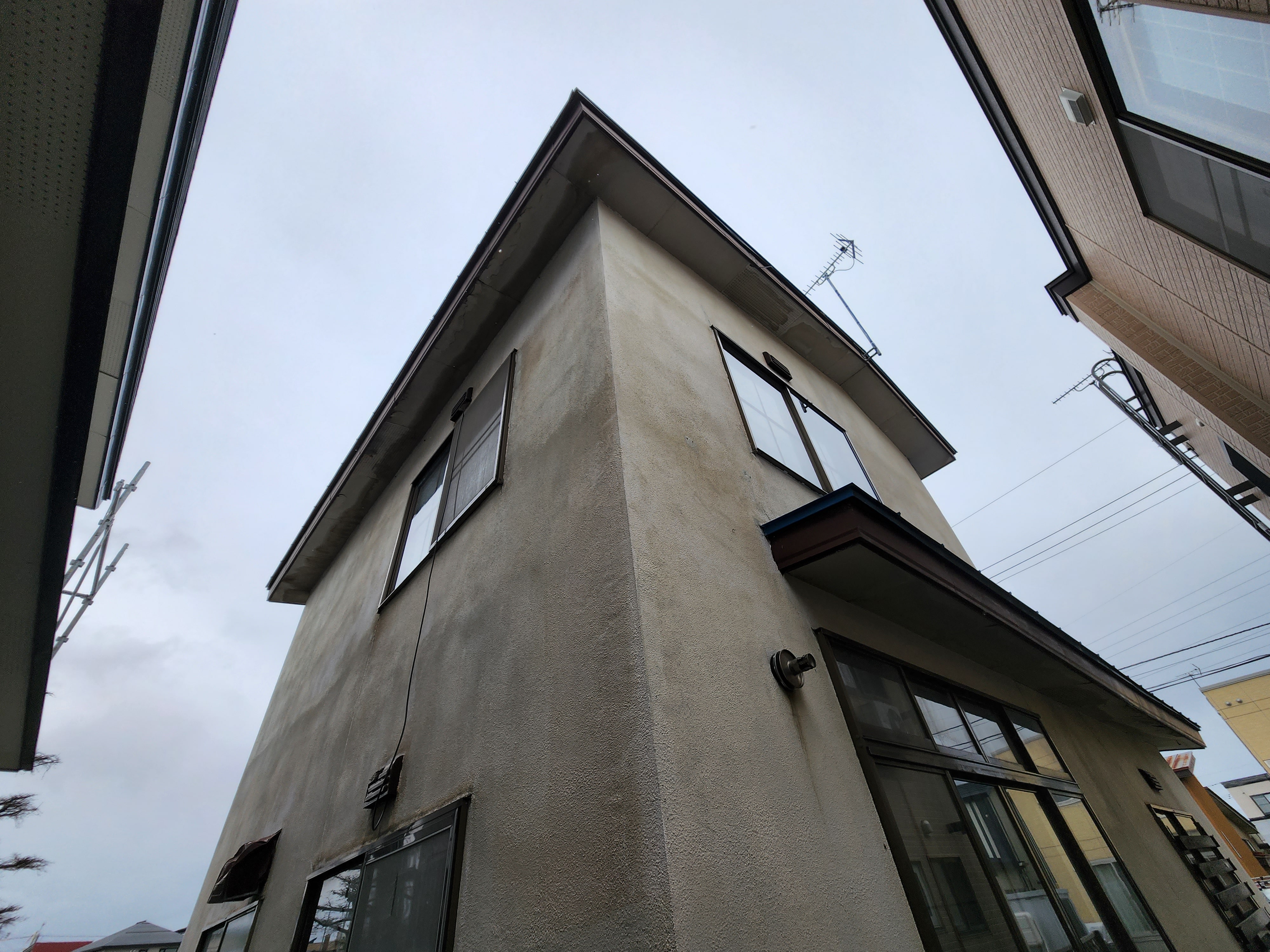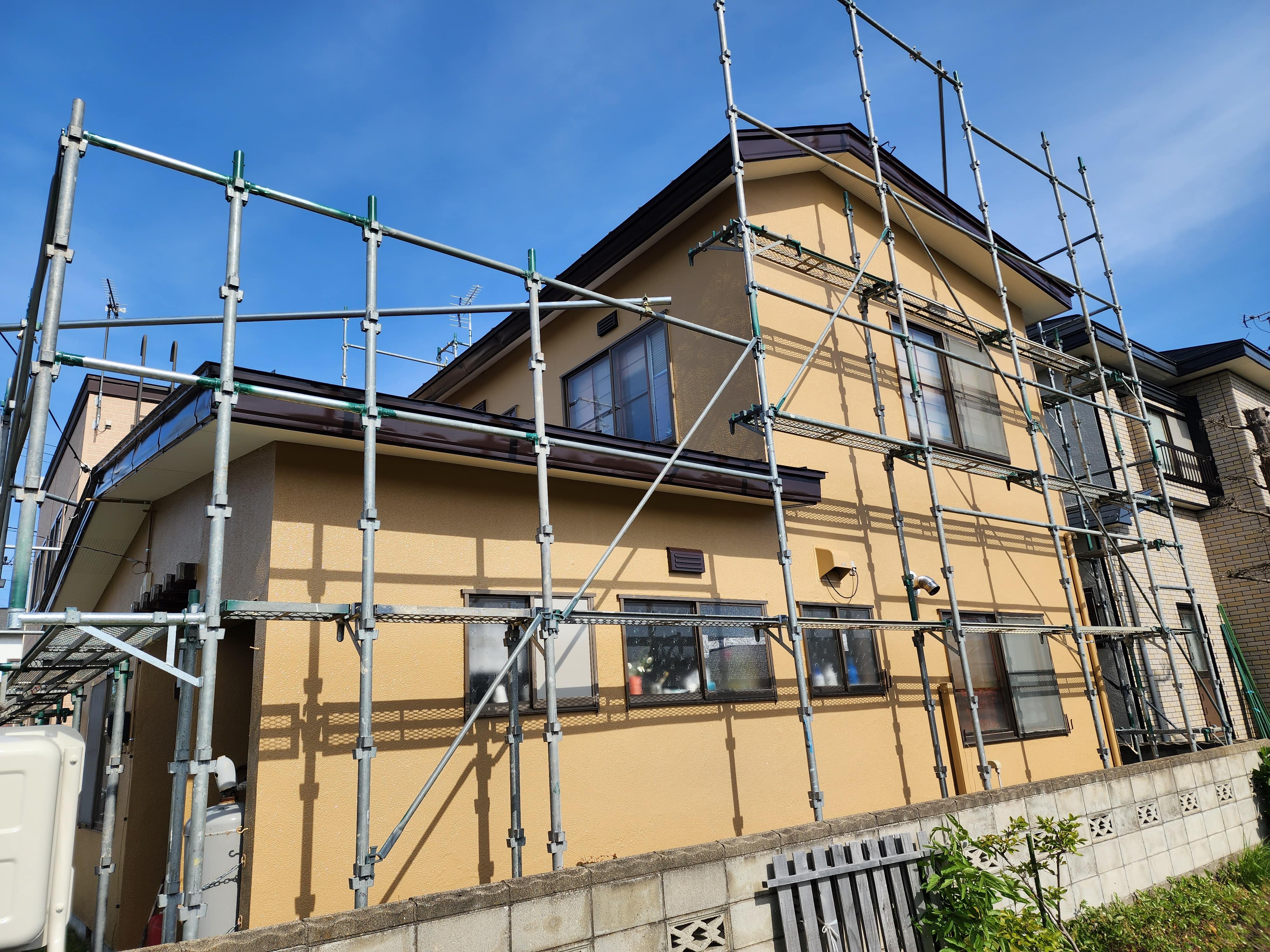 青森市内S2様邸:ポイントはモルタル外壁材に細めのヘアークラック(髪の毛程度の細さのひび割れ)も多いですが深めのクラック(ひび割れ)が多々あり、通常レベルの塗装工程だと早期のクラック(ひび割れ)がでてしまう為クラック(ひび割れ)が塗膜面への再発生を抑える為と、既存のクラック(ひび割れ)の補修跡を目立たなくし塗装仕上がりを美しくする為にマスチックローラー工法を選定いたしました。。