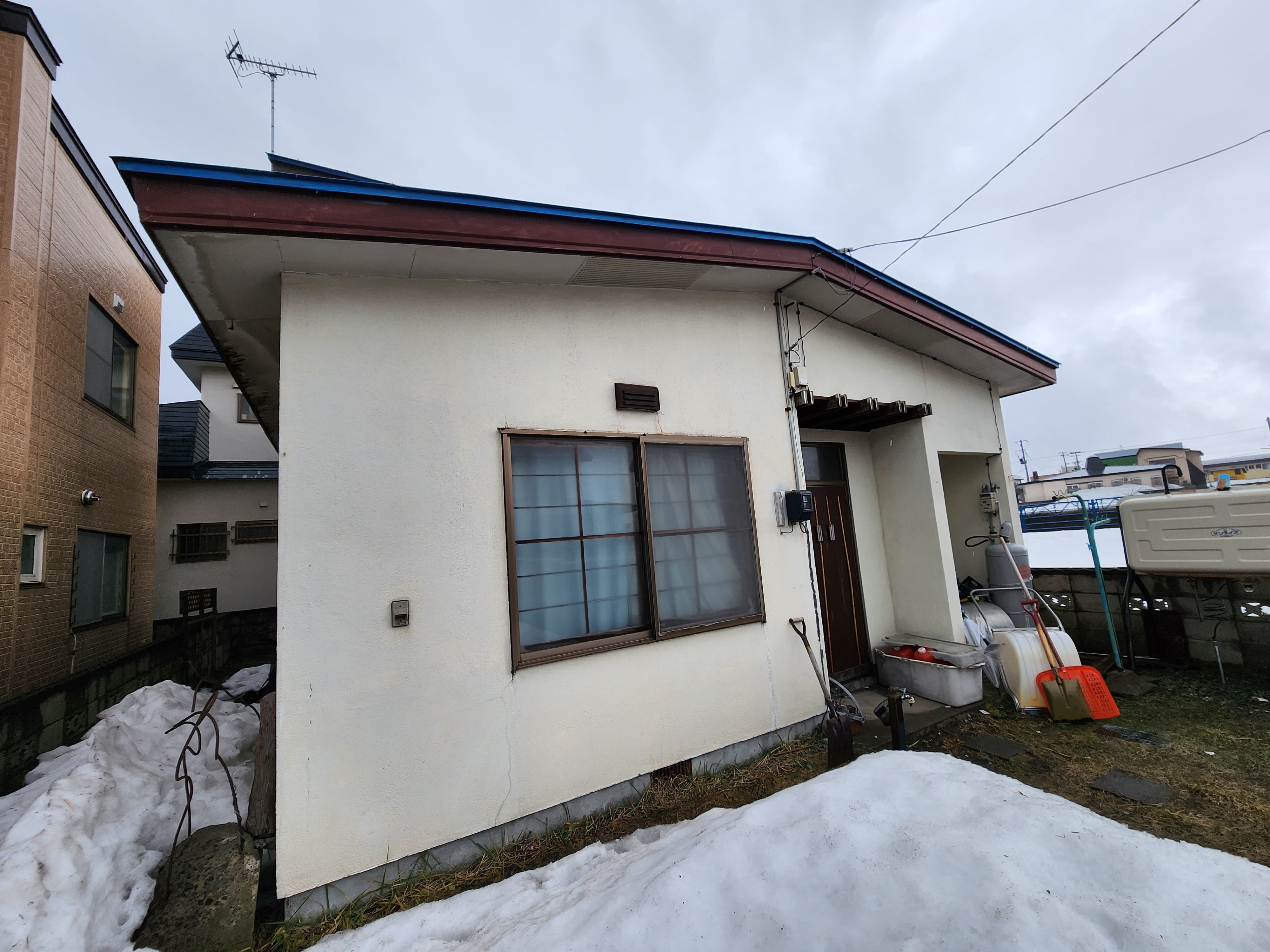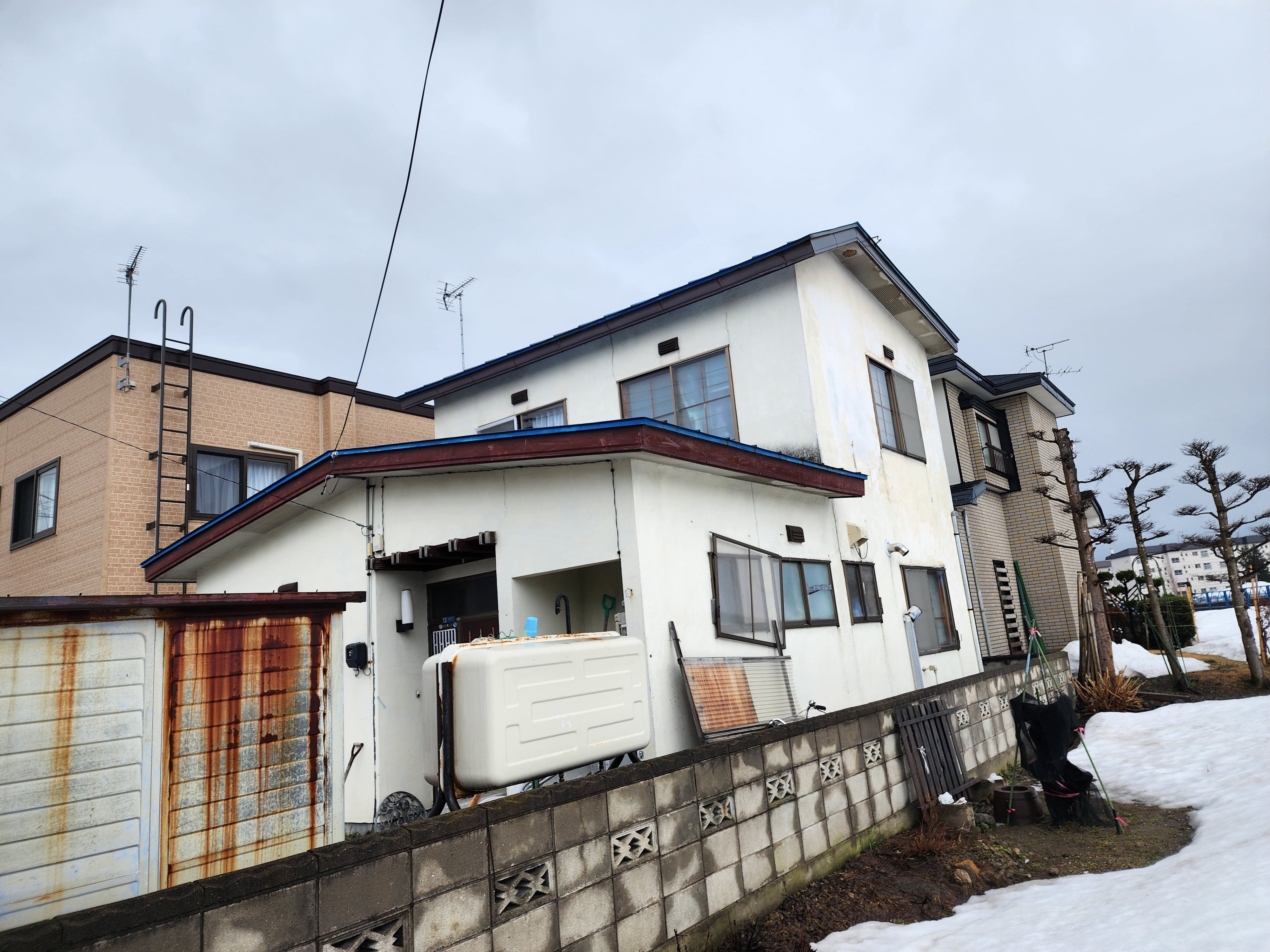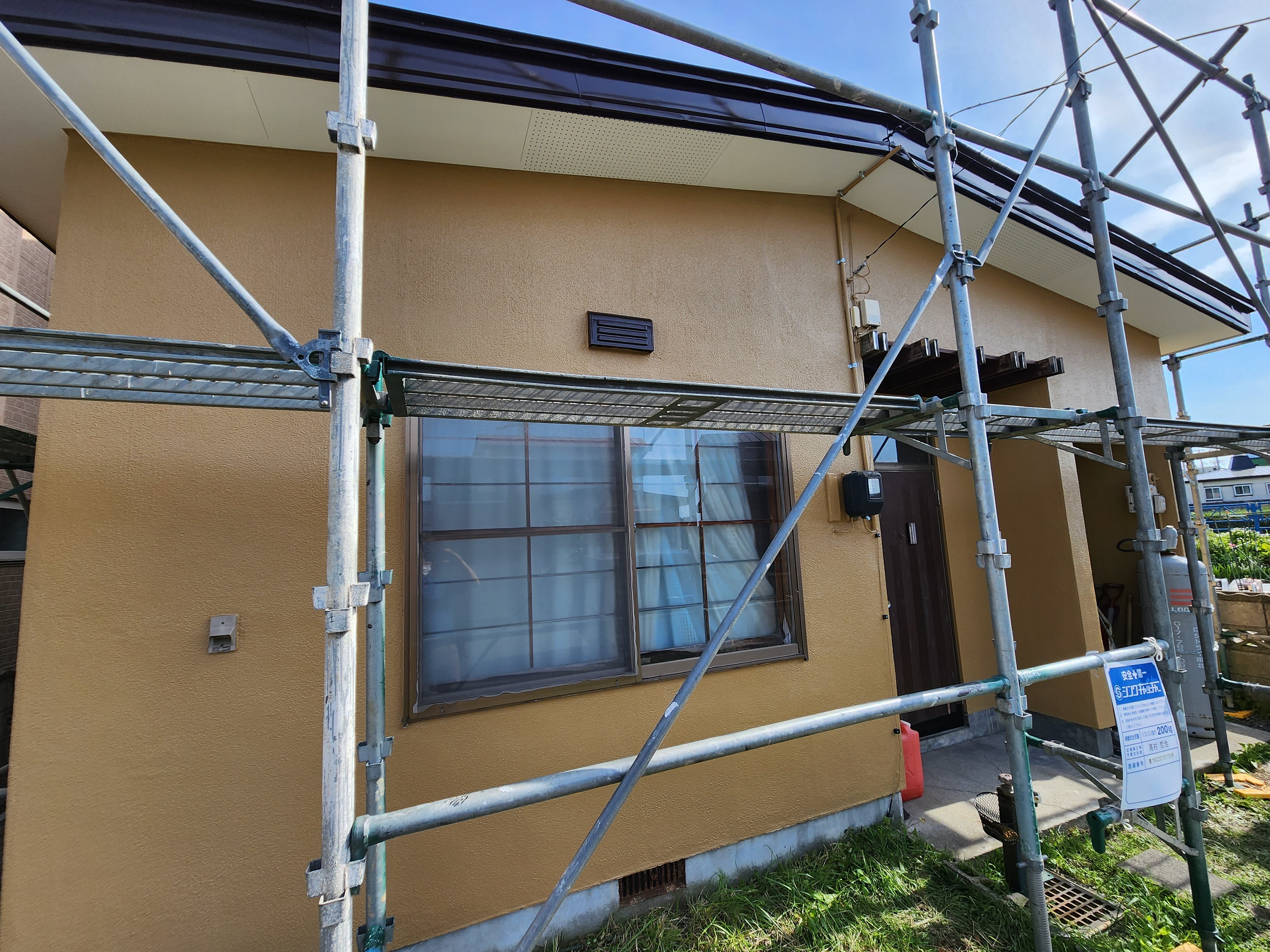 青森市内S2様邸:ポイントはモルタル外壁材に細めのヘアークラック(髪の毛程度の細さのひび割れ)も多いですが深めのクラック(ひび割れ)が多々あり、通常レベルの塗装工程だと早期のクラック(ひび割れ)がでてしまう為クラック(ひび割れ)が塗膜面への再発生を抑える為と、既存のクラック(ひび割れ)の補修跡を目立たなくし塗装仕上がりを美しくする為にマスチックローラー工法を選定いたしました。。